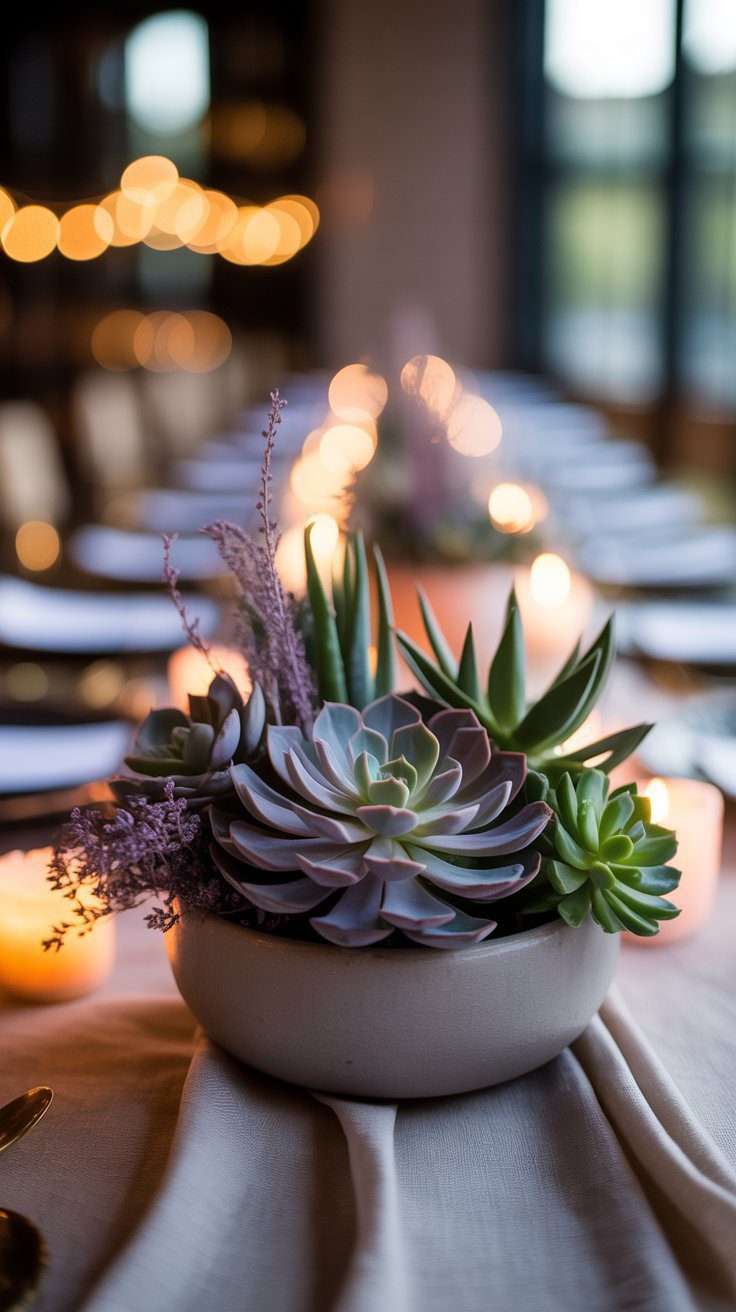 This is a more modern take, and it is gorgeous. Purple-toned succulents paired with a cleaner arrangement of greenery feel fresh, sculptural, and slightly unexpected.