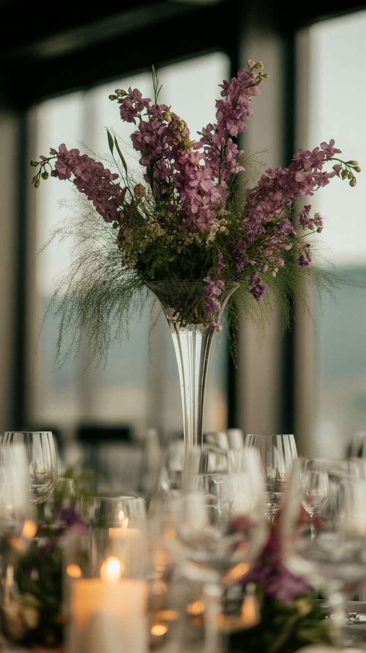 This is one of the easiest purple flower centerpiece ideas to make look abundant, which is great if your audience wants impact without needing dozens of flower varieties.