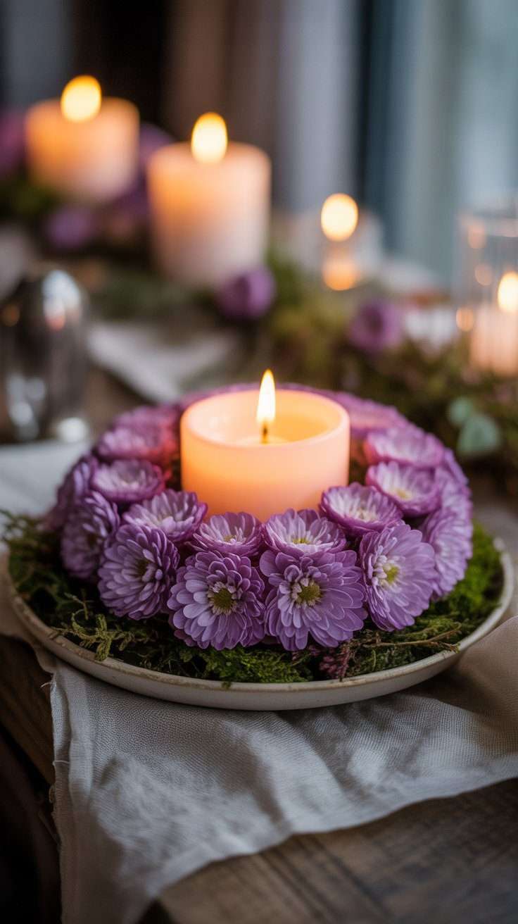 A floral candle ring is such a good idea when you want the flowers to frame the table instead of blocking conversation. Purple floral rings around pillar candles feel romantic, pretty, and very usable for weddings and dinner parties.