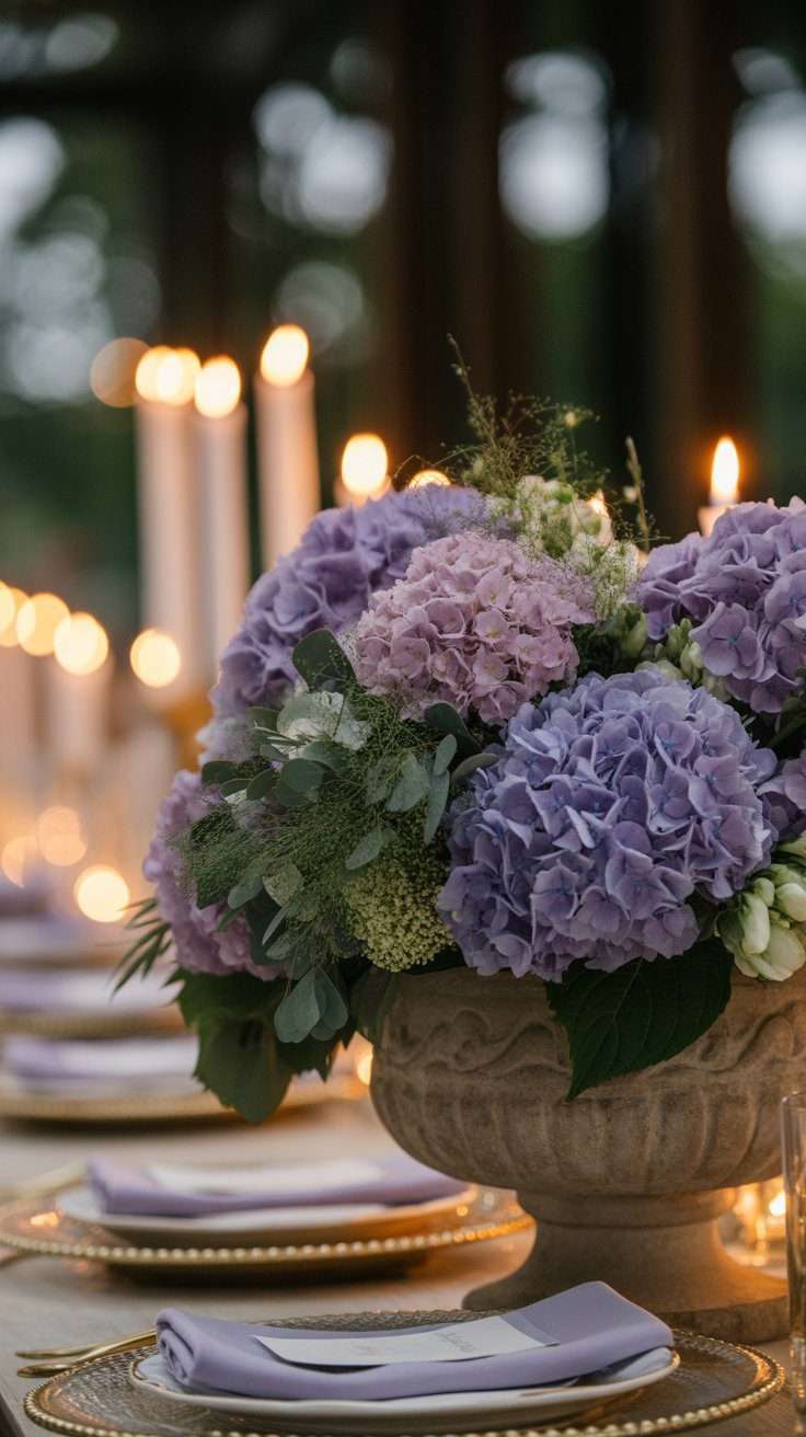 Hydrangeas always help a centerpiece feel full. Purple hydrangeas mixed with eucalyptus or ruscus create that lush look a lot of readers want for weddings.