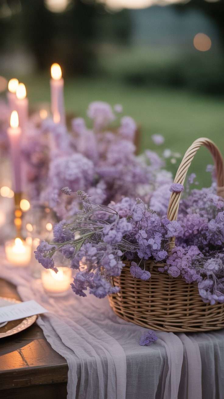 This version feels softer, relaxed, and full of charm. Purple flowers arranged in low woven baskets bring a garden wedding feel that looks natural but still very pretty.