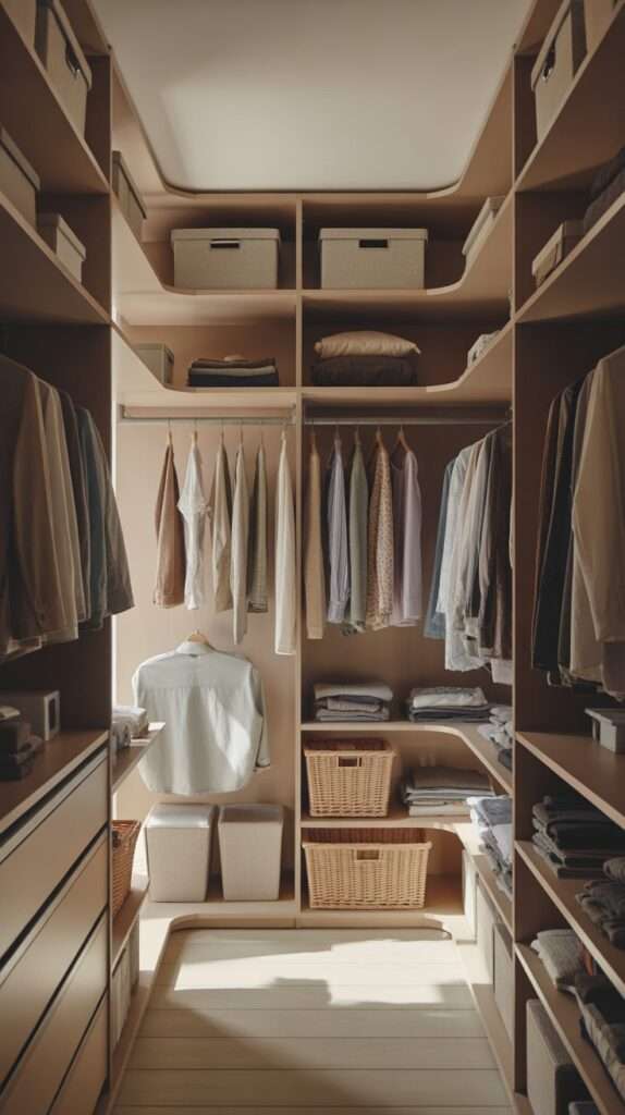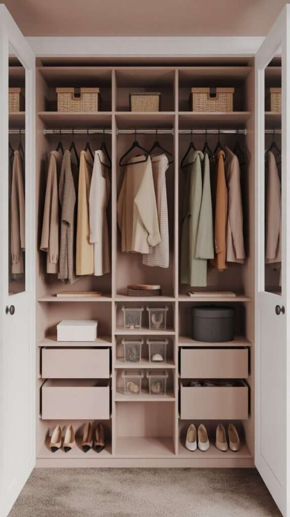 Pro tip: think in “zones.” Create vertical categories — shelves up top, hanging in the middle, baskets or drawers below. This closet layout approach not only maximizes space but also makes getting dressed stress-free because you know exactly where to look.