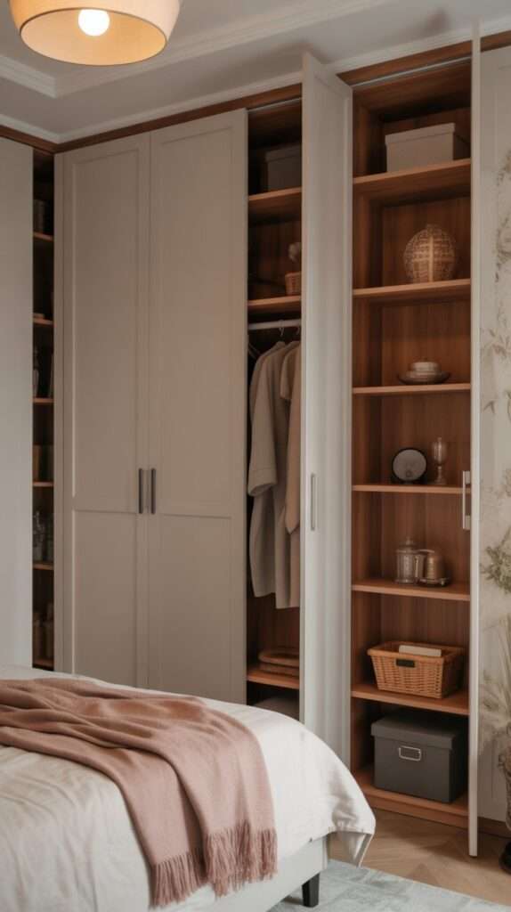 A small closet doesn’t have to stand alone. Blend it into your room organization bedroom by adding custom-built shelves around the closet doors or even creating a built-in wardrobe wall. This allows you to store books, accessories, and even décor items while expanding your usable space. Use baskets and labeled bins to keep everything tidy and avoid the “messy corner” look.
