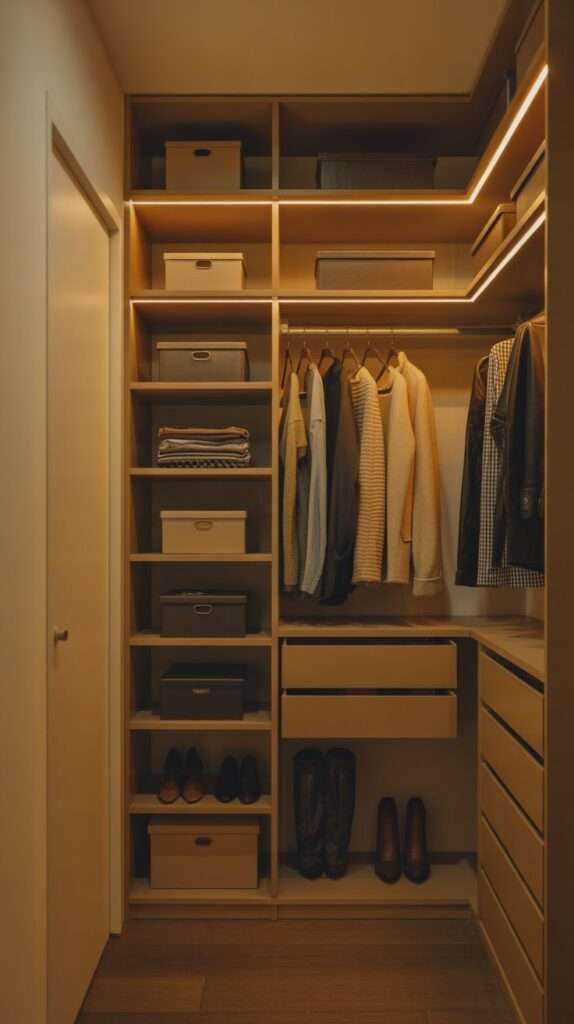 Start small with LED strip lights along the top shelf or vertical edges. They’re inexpensive, easy to install, and create an instant boutique look. If you want something even more practical, try motion-sensor puck lights — they turn on the second you open the door, so no more fumbling in the dark. For those who want to blend function with style, a mini chandelier or pendant light can completely change the mood of a small closet organization bedroom, making it feel like a high-end dressing room instead of just storage.