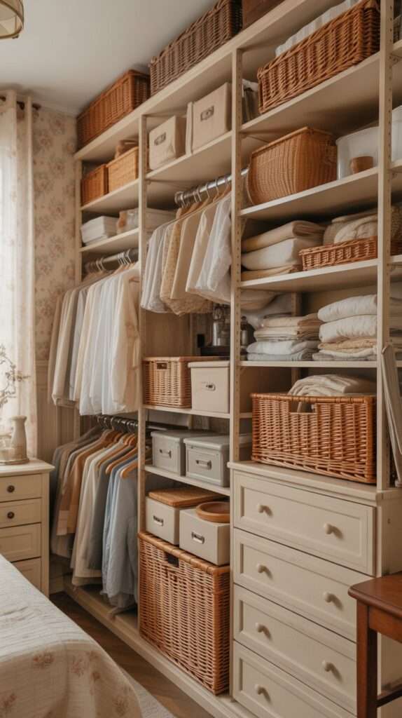 One of the most overlooked tricks in small closet organization bedroom setups is vertical space. Instead of cramming clothes onto one hanging rod, install double rods — one for shirts and jackets, and one for pants or skirts. Add narrow shelving all the way to the ceiling for boxes, handbags, and seasonal items. This makes the closet feel bigger and keeps your room organization bedroom clean and clutter-free. Start by looking up. The area above your top shelf is often underutilized, yet it’s the perfect spot for storing items you don’t reach for daily. Think of seasonal clothes, luggage, or bulkier bedding. Add stackable bins or woven baskets so everything looks cohesive and doesn’t collect dust.