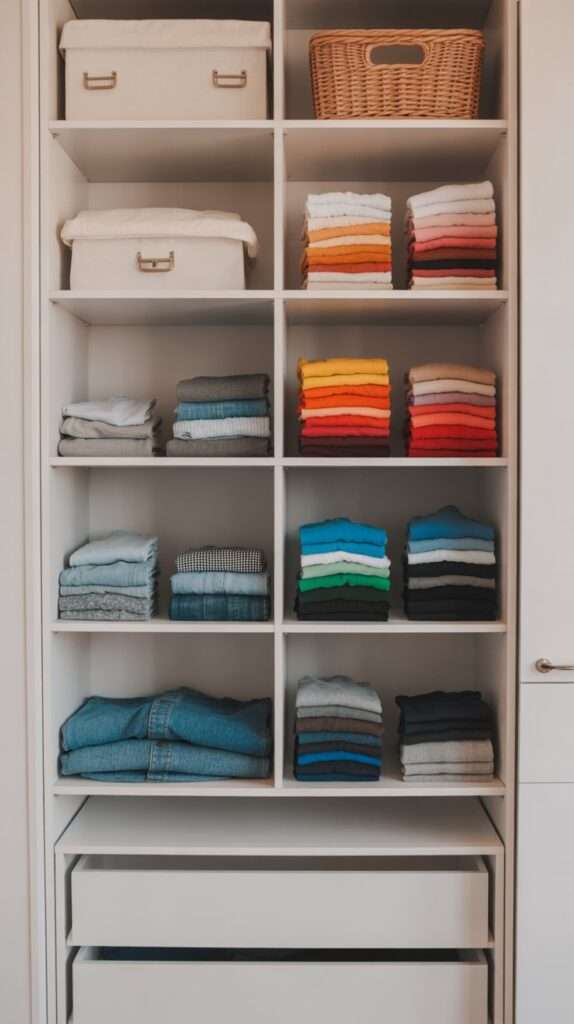 - Top zone: shelves for baskets, seasonal clothes, or bulky items.