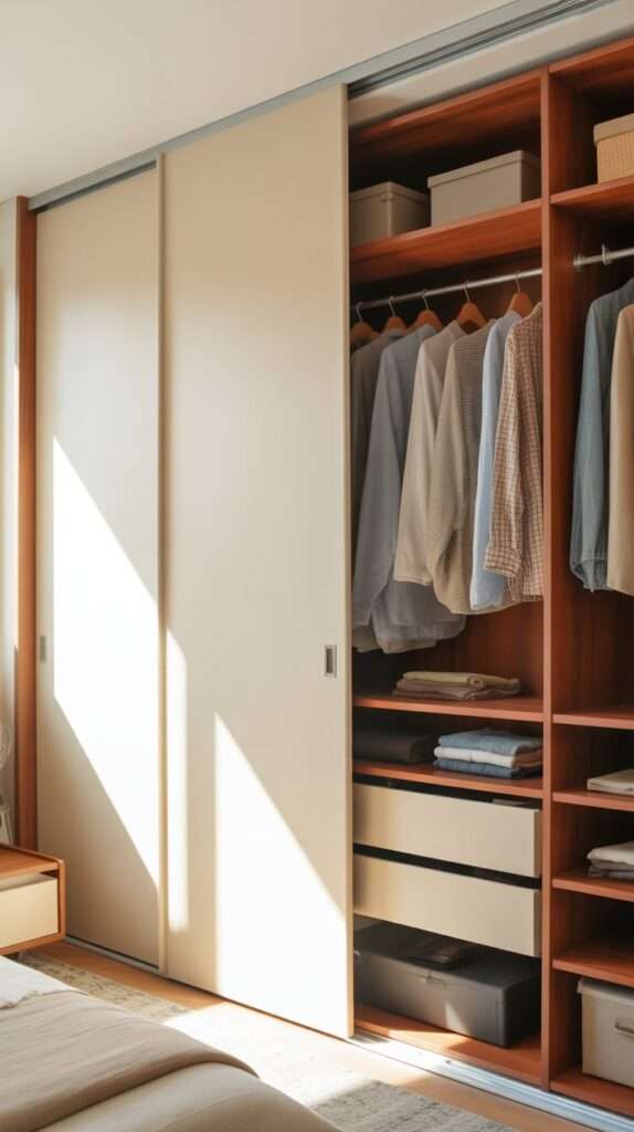 Sometimes, the best solution for a small closet is… no door at all. Open concept wardrobes are trendy and give you quick access to your clothes. Add a clothing rack, shelves, and baskets in a minimalist setup. Keep it neat with coordinated hangers and a color-coded system so it looks intentional. Pairing this with a room organization bedroom plan can create a chic, boutique-like vibe.