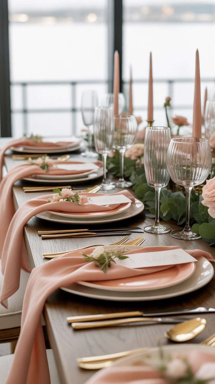 I love this because it keeps soft pink from feeling too one-note. A slightly warmer napkin tone gives the place setting more life. It also photographs beautifully against white plates and gold flatware.