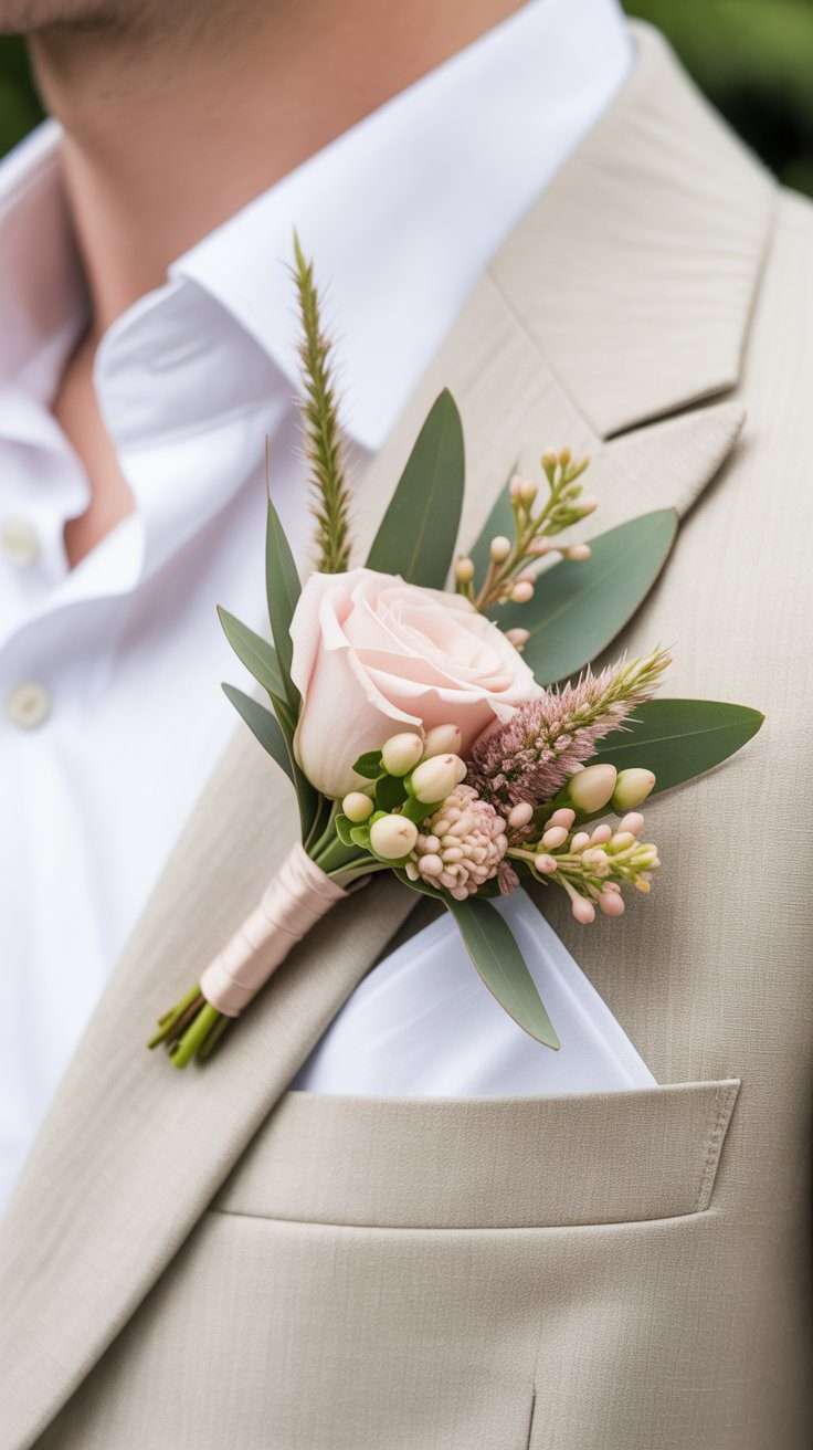 These look delicate, timeless, and very polished in photos. Soft pink boutonnieres with eucalyptus or olive branches feel romantic without being too much. They tie everything together in a subtle way.