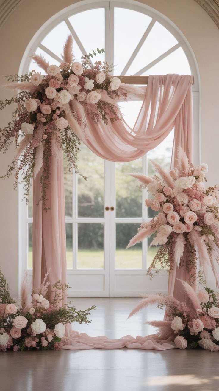 A soft pink ceremony arch feels romantic right away. You can use draped fabric, roses, garden-style florals, or a more natural broken arch shape if you want something less formal.