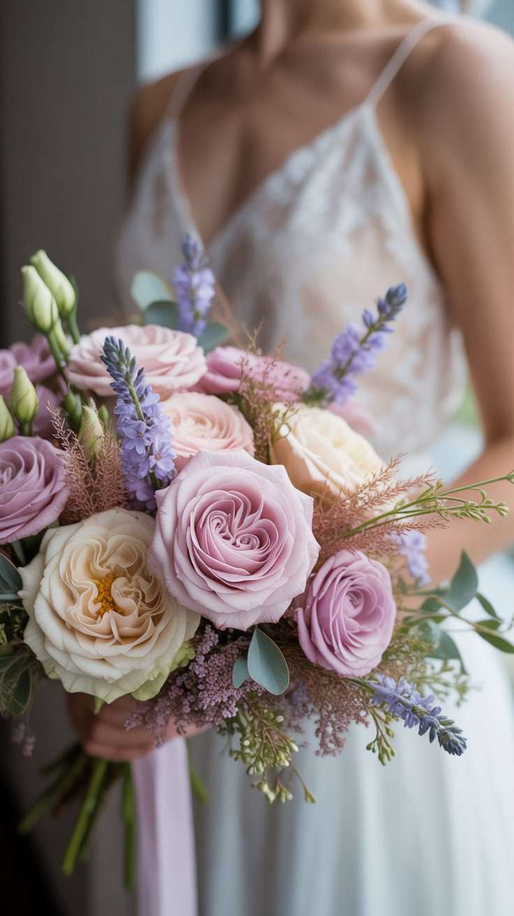 This is where things start getting really beautiful. A bouquet with soft pink roses, cream blooms, and touches of lavender has that airy romantic look without feeling flat. The extra hint of purple gives the whole palette a little depth.