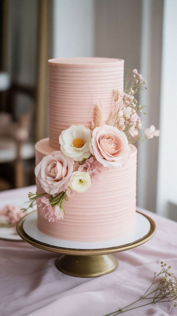 A soft pink cake can go in so many directions. It can feel classic, garden-inspired, modern, or even slightly vintage depending on the finish. I love when it is decorated with fresh blooms instead of too much heavy piping.