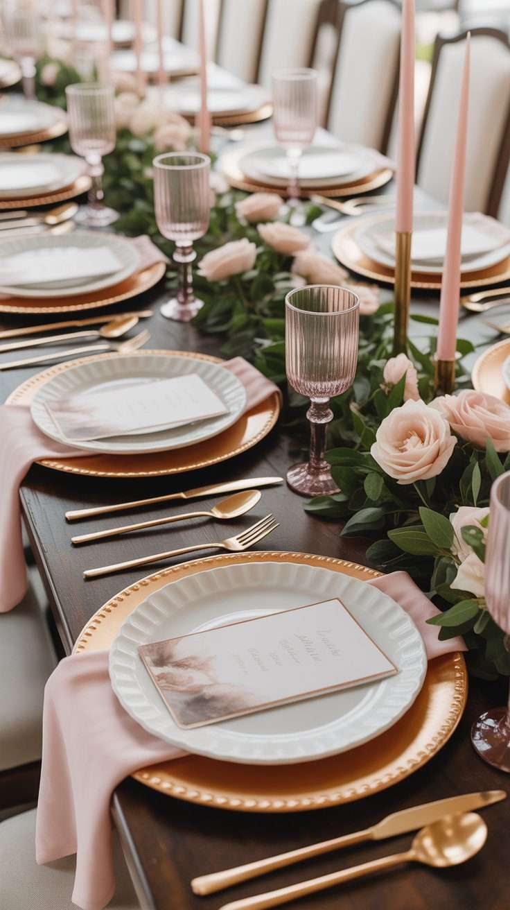 This is one of those details that makes everything feel more finished. Rose gold chargers under white plates look polished and feminine without trying too hard. They work especially well if you want a little glow on the tables without making the decor look flashy.