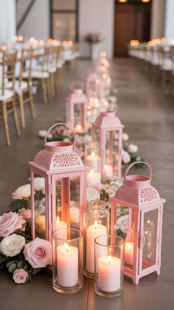 Lanterns are such a good detail when you want warmth without too much clutter. Mix soft pink lanterns, glass candle holders, and floral clusters around the room to create glow and softness.