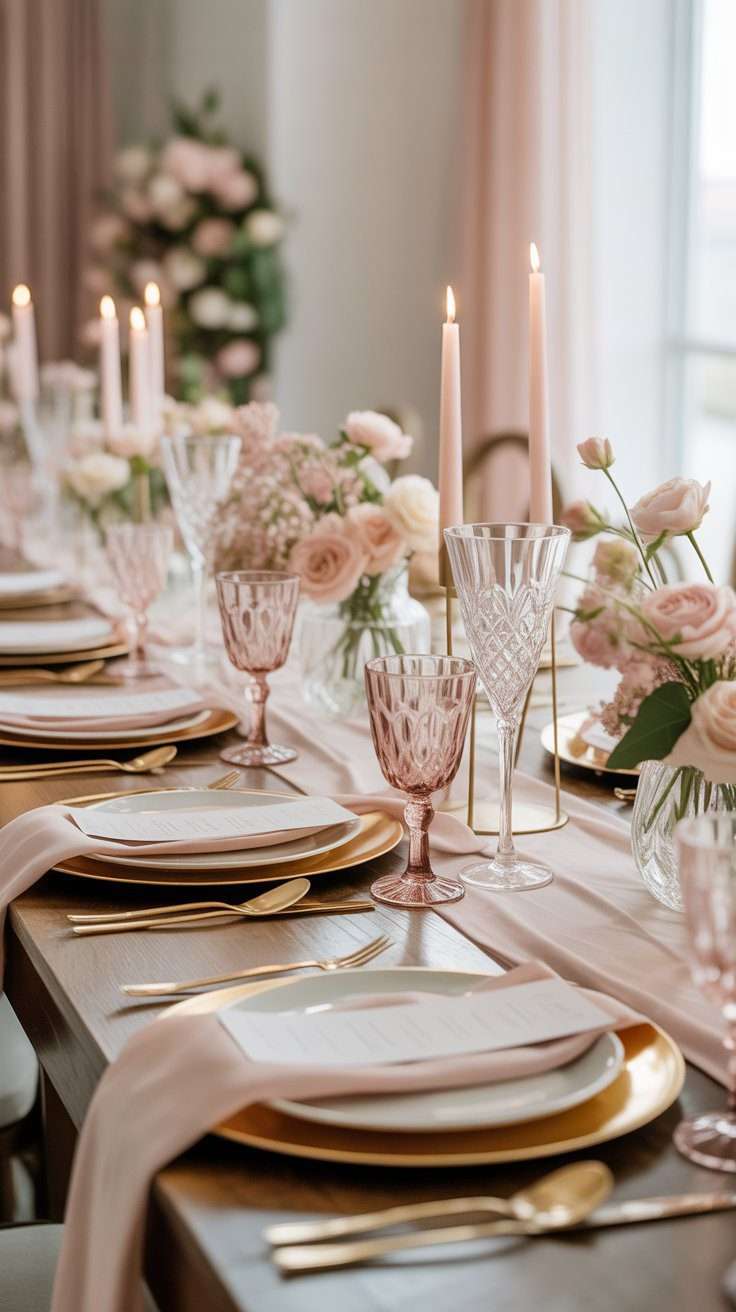 If I were building this look from scratch, I would combine blush linens, rose gold chargers, fuller pink florals, a touch of lavender, and a few subtle old money elements so everything feels timeless instead of trendy. Then I would soften it with a little bohemian movement or a slightly rustic touch depending on the venue.