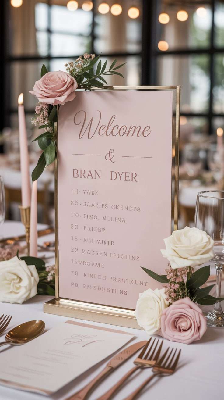 Welcome signs, seating charts, table numbers, and bar menus all look more polished when they follow the same palette. Rose gold or metallic pink details give the whole wedding a soft glow and a slightly glamorous finish.