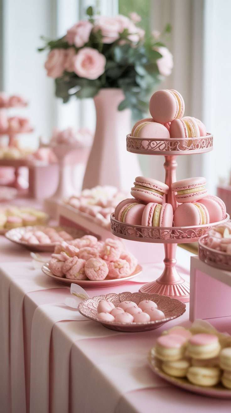 A soft pink dessert display can be so pretty for weddings, engagement parties, or even a romantic bridal shower. Macarons, frosted cookies, mini cakes, candies, and champagne-toned stands all work beautifully together.