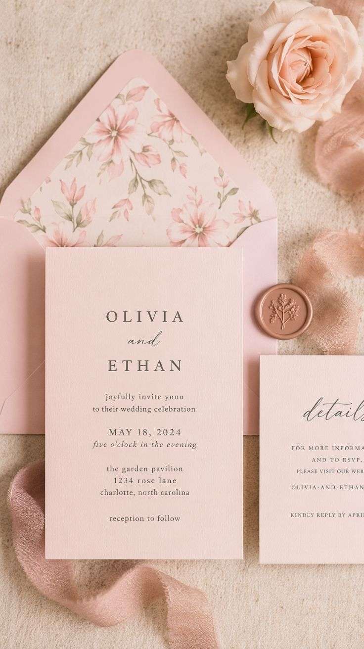 Your invitations set the tone before anyone even sees the venue. Soft pink paper with clean typography, deckled edges, or a subtle ribbon already gives that romantic first impression. This is one of the easiest ways to make the whole wedding feel cohesive from the beginning.