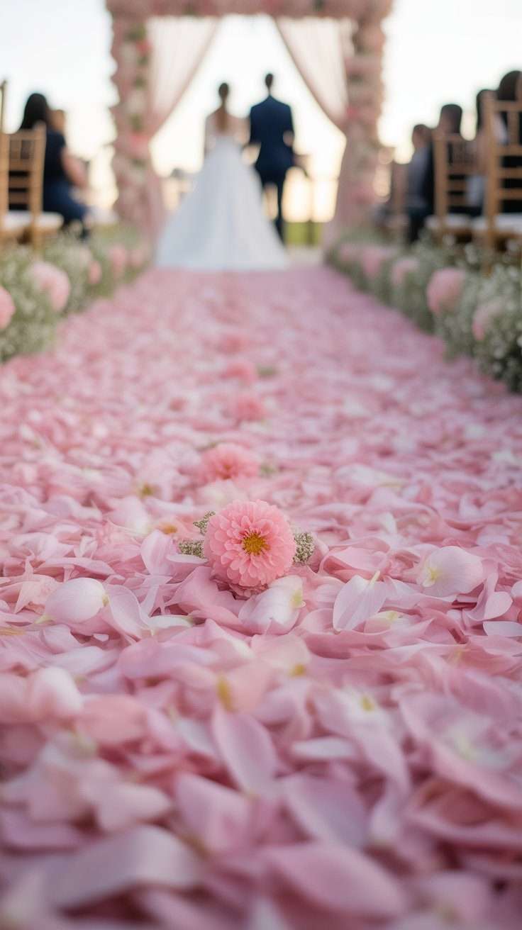 This always looks romantic, and it works for both indoor and outdoor weddings. Soft pink petals or a mix of blush and cream petals create a dreamy ceremony entrance without needing a ton of décor.