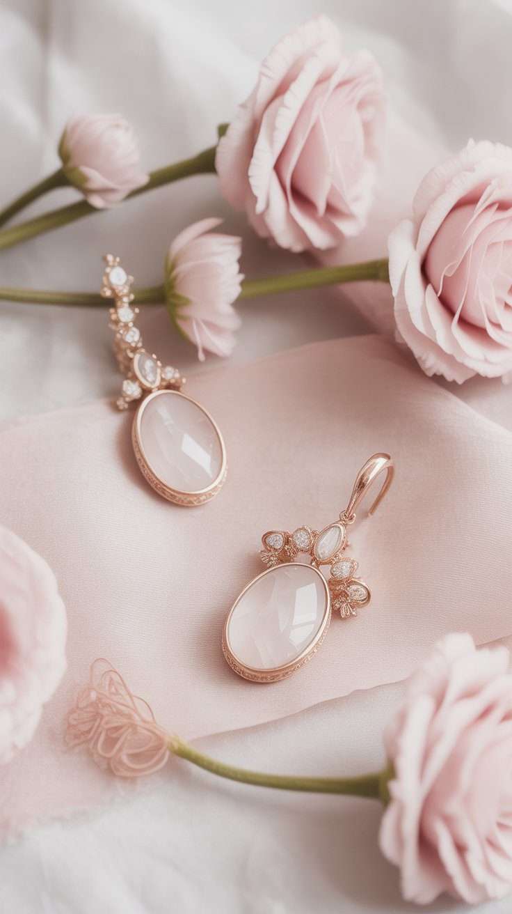 Rose quartz jewelry or accessories bring in one last delicate pink touch. Earrings, bracelets, or a small pendant can feel meaningful and feminine without competing with the dress.