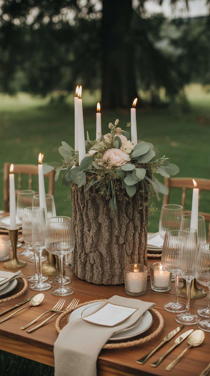 This idea has a stronger rustic feel, but it can be very charming when balanced with soft elements. A tree stump stand topped with candles, greenery, and a small floral arrangement creates a centerpiece that feels natural and cozy.