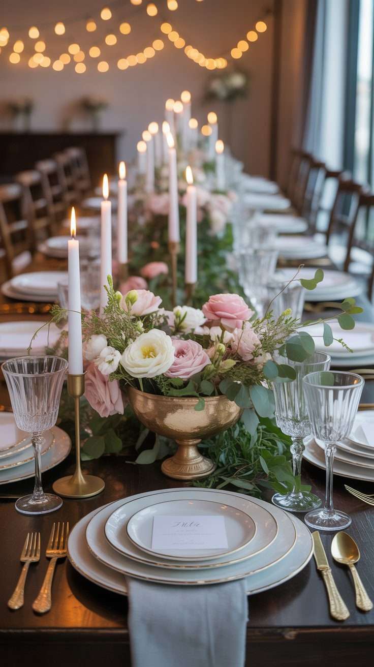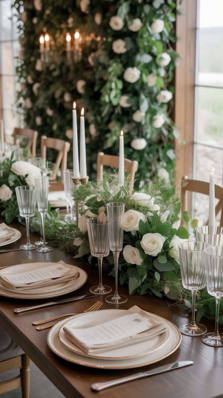 If you want your tables to feel soft and elegant, a green-and-ivory palette is always a beautiful choice. Add trailing vines or loose greenery, and the whole centerpiece starts to feel lush and woodland-inspired without being heavy.
