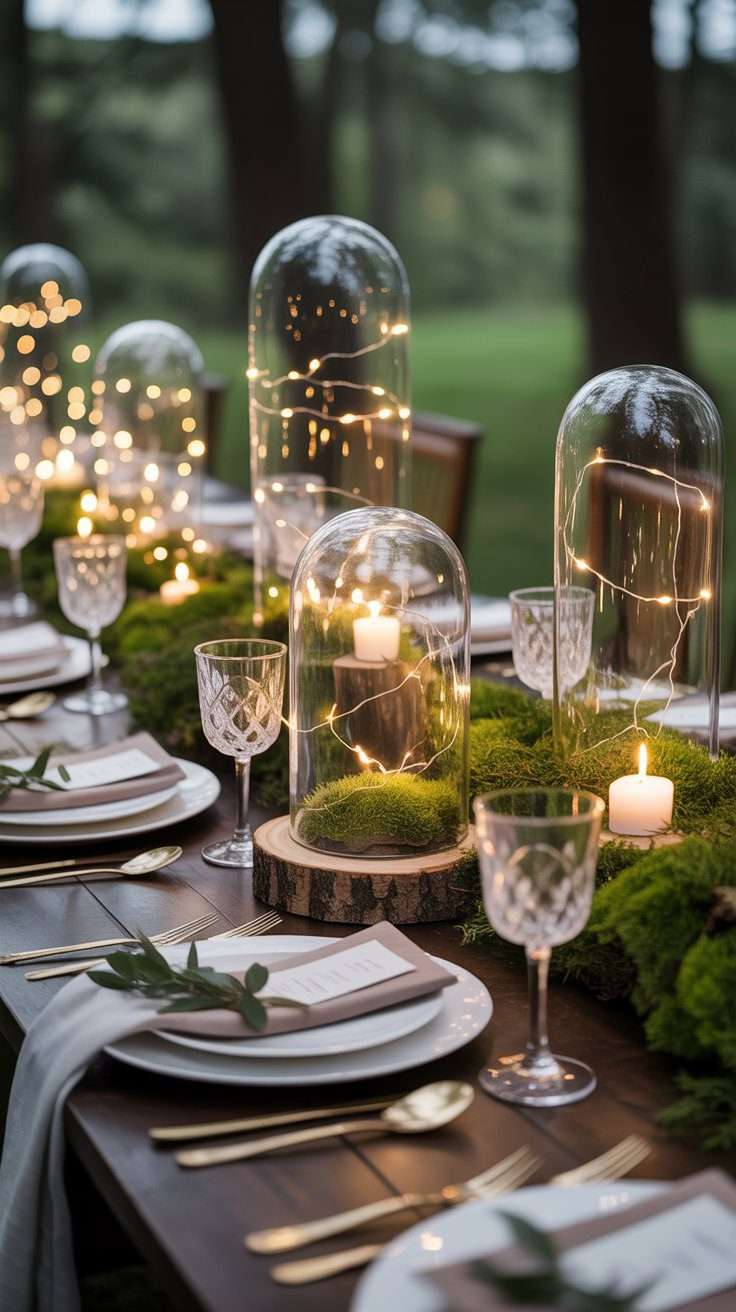 This is one of those centerpiece ideas that feels magical right away. A glass cloche with moss, twinkle lights, or even a small floral detail creates a soft enchanted-forest look. It is delicate, eye-catching, and so lovely for evening receptions.