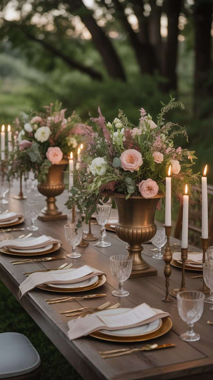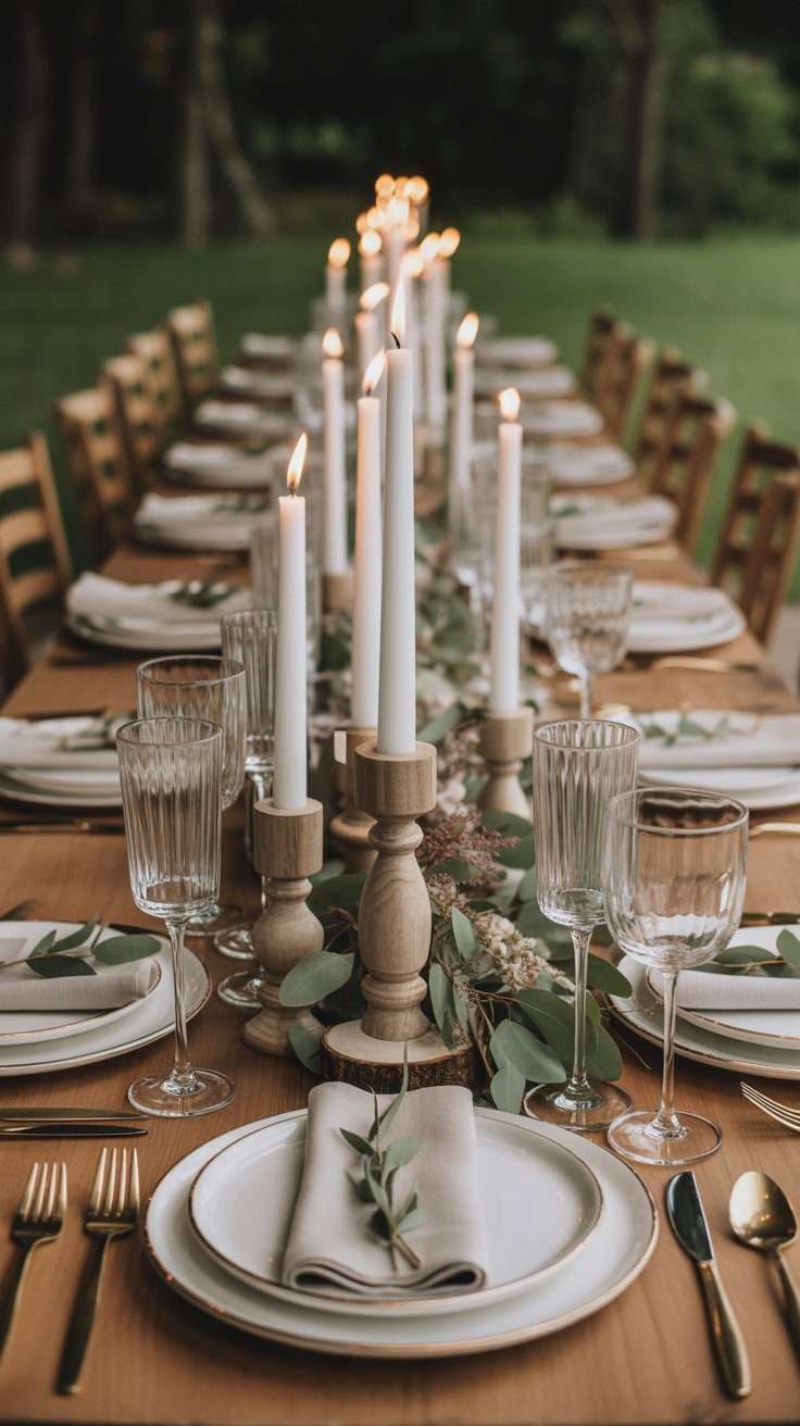 If you want a more timeless version of the woodland look, vintage candle holders are such a beautiful choice. Mixed with soft greenery and a few delicate blooms, they give the table a romantic old money glow without feeling overdone.