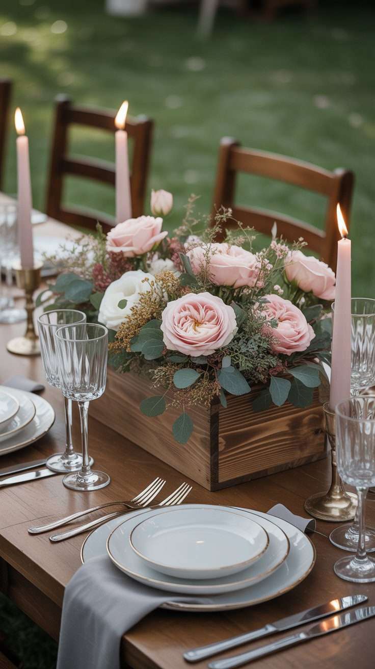 A wooden box centerpiece feels rustic in the prettiest way. Fill it with loose garden roses, greenery, and maybe a few berries, and it becomes the kind of arrangement that feels full, abundant, and warm. It works especially well for long banquet tables.