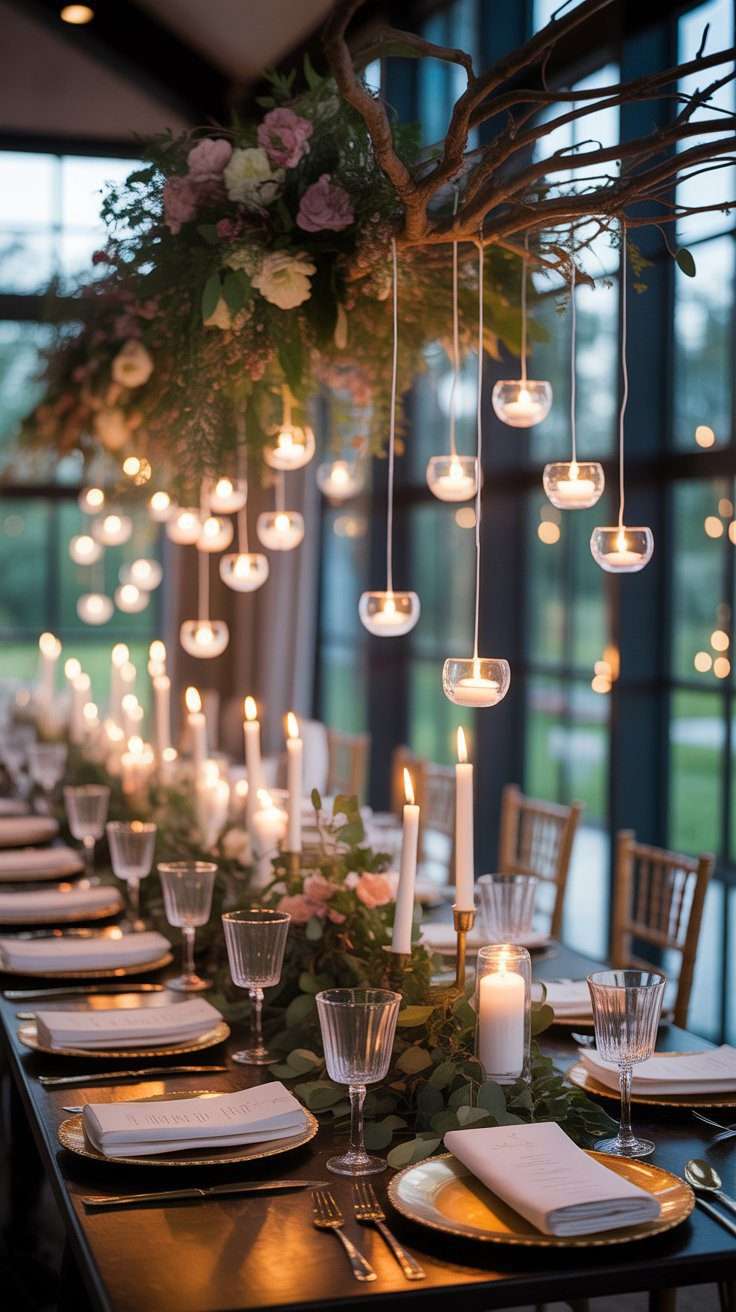 For a more dramatic look, tall branches can make a stunning centerpiece. Add a few hanging tea lights or delicate glass ornaments, and it instantly feels romantic and special. This is such a pretty way to bring that forest feeling into the reception space.