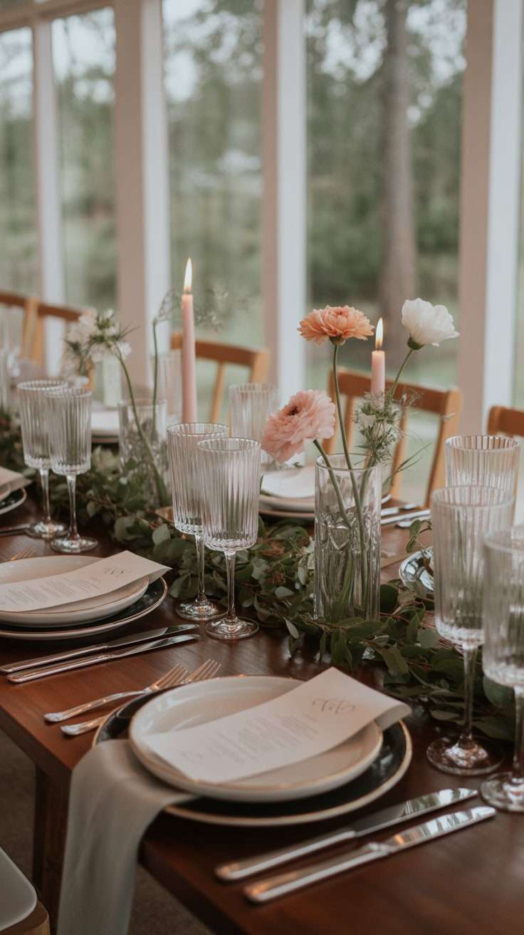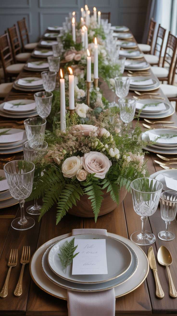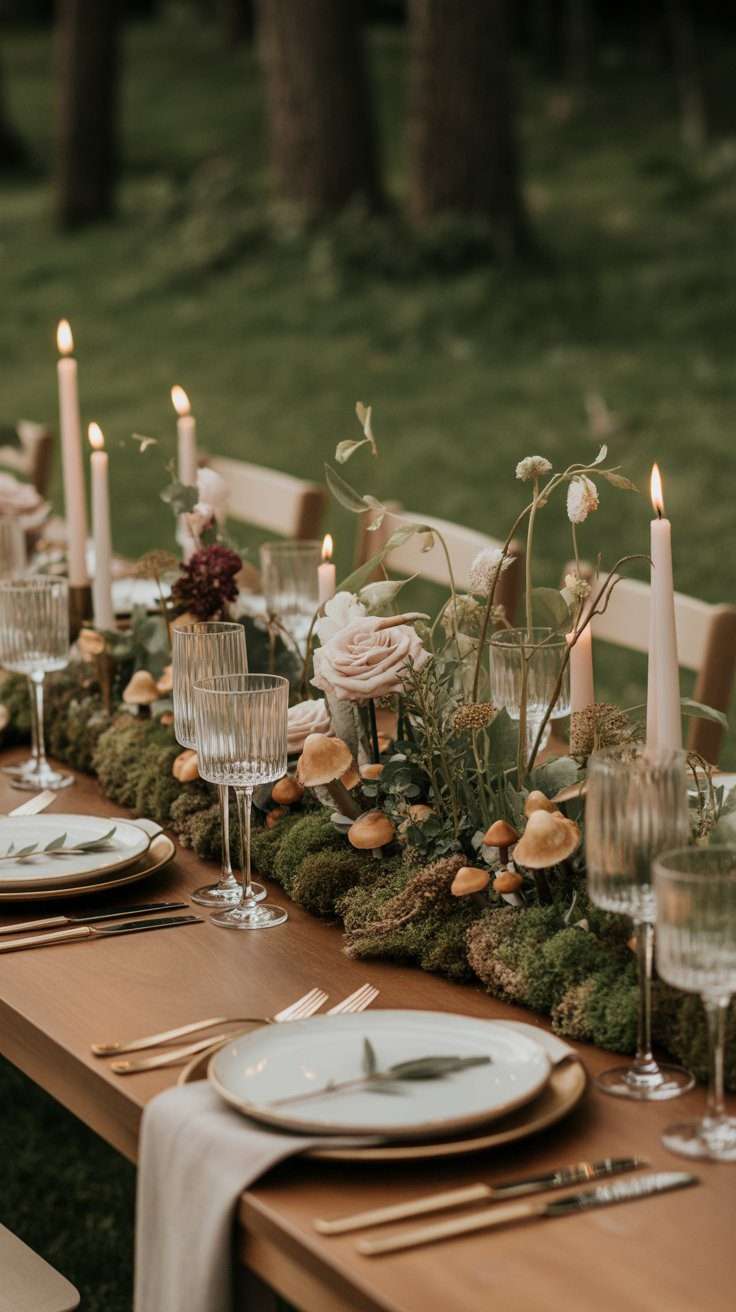This one leans more whimsical, but it can still feel refined when styled well. A low floral arrangement with moss and a few decorative mushrooms creates a magical woodland mood. It is perfect if you want your tables to feel a little more enchanting.