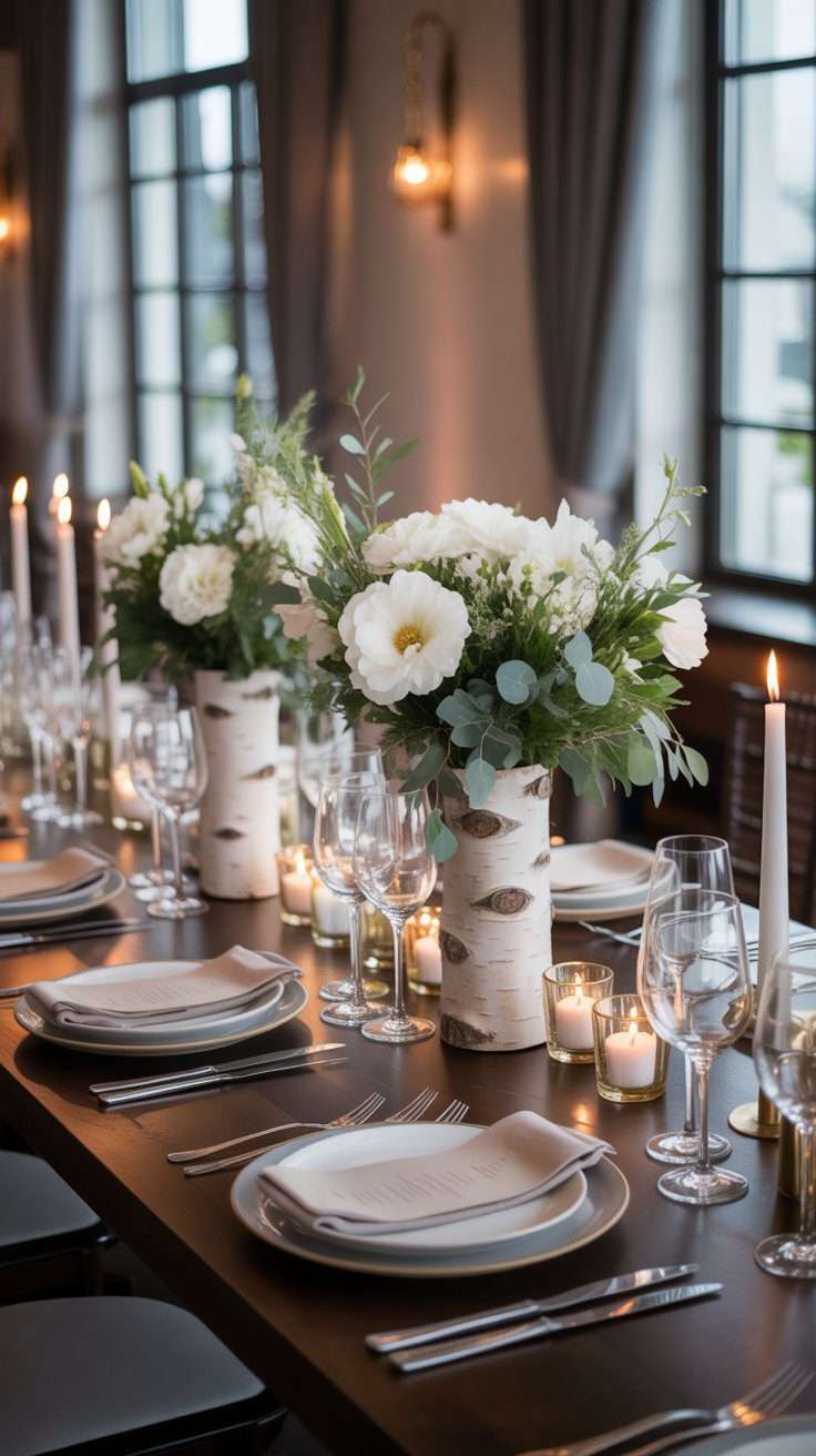 Birch details bring in that woodsy feeling without looking too heavy. Pairing a birch-style vase with white flowers and greenery creates a centerpiece that feels rustic but still elegant. It is one of those looks that works beautifully in every season.