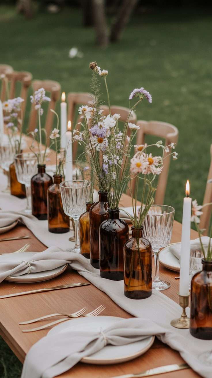 This idea has such a sweet, relaxed beauty. Amber bottles bring warmth to the table, and wildflowers keep everything feeling soft and natural. It is a lovely choice for brides who want a woodland look that feels effortless and charming.