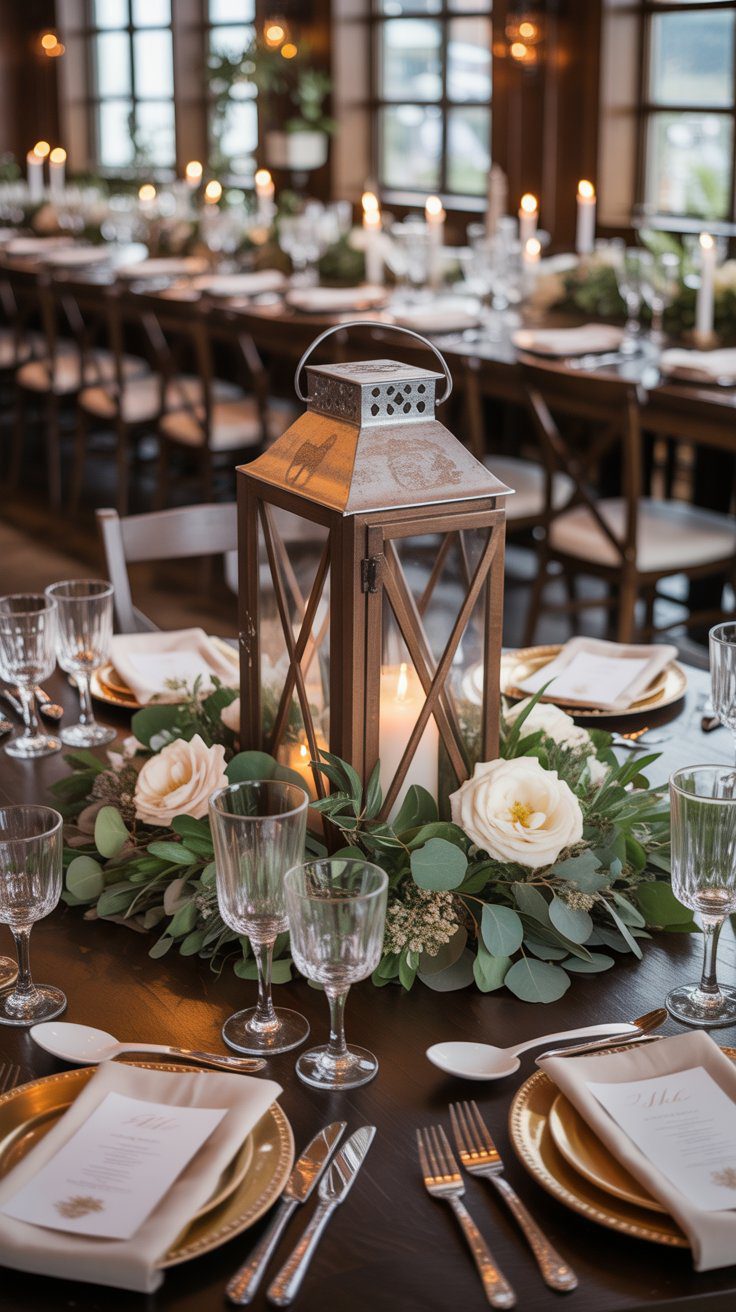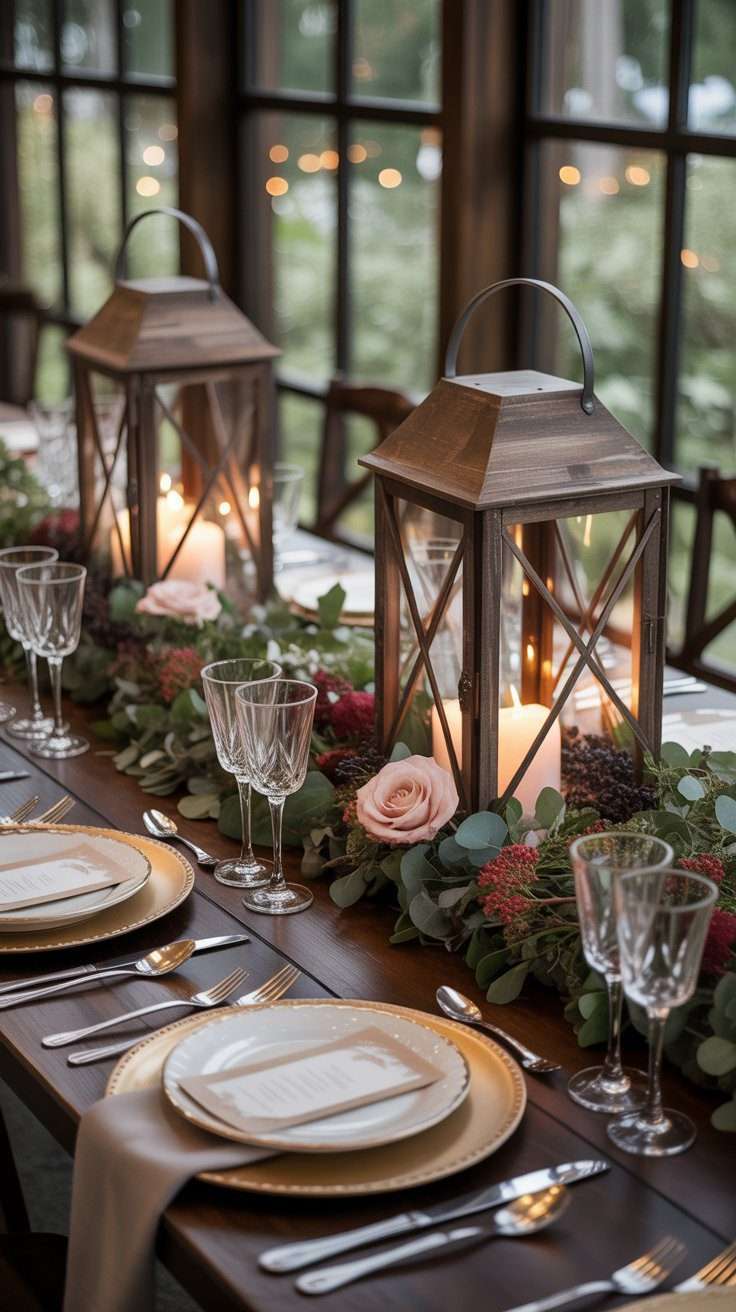 Lanterns already feel cozy, but adding roses, berries, and greenery makes them even prettier. This kind of centerpiece has that romantic woodland charm while still feeling polished enough for a wedding.