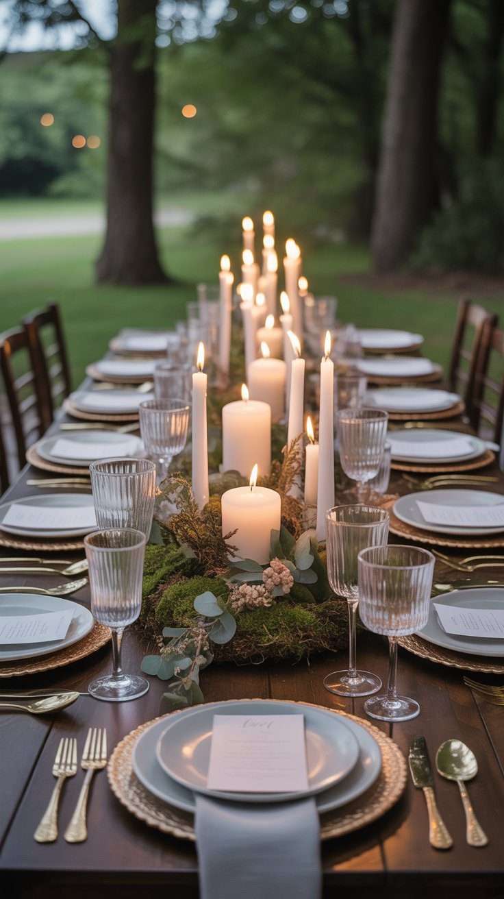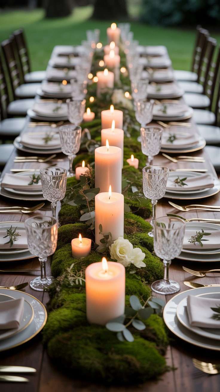 If you want a centerpiece that feels straight out of an enchanted forest, a moss runner is such a pretty option. Add pillar candles in different heights and the whole table starts to glow in the most beautiful way. It feels earthy, warm, and full of texture.