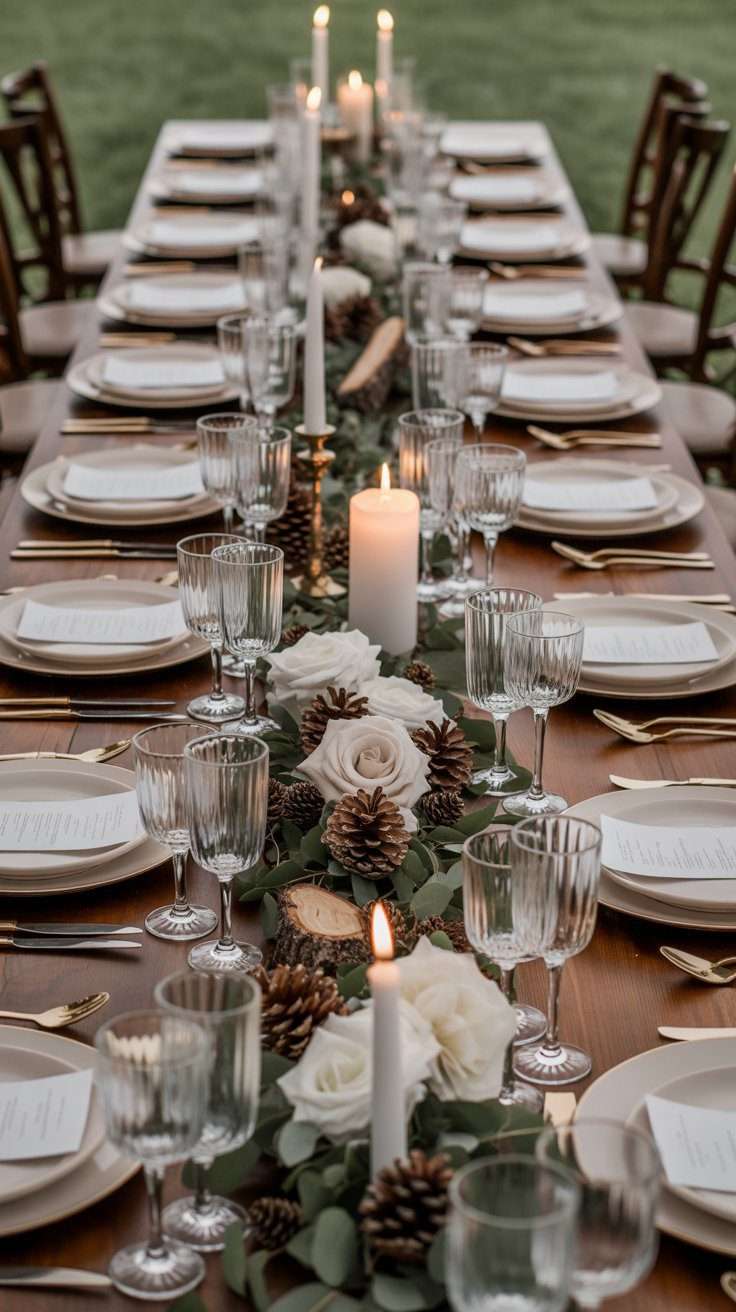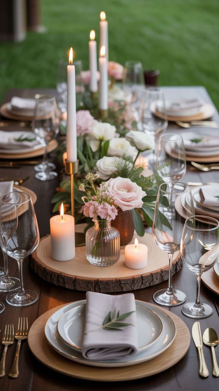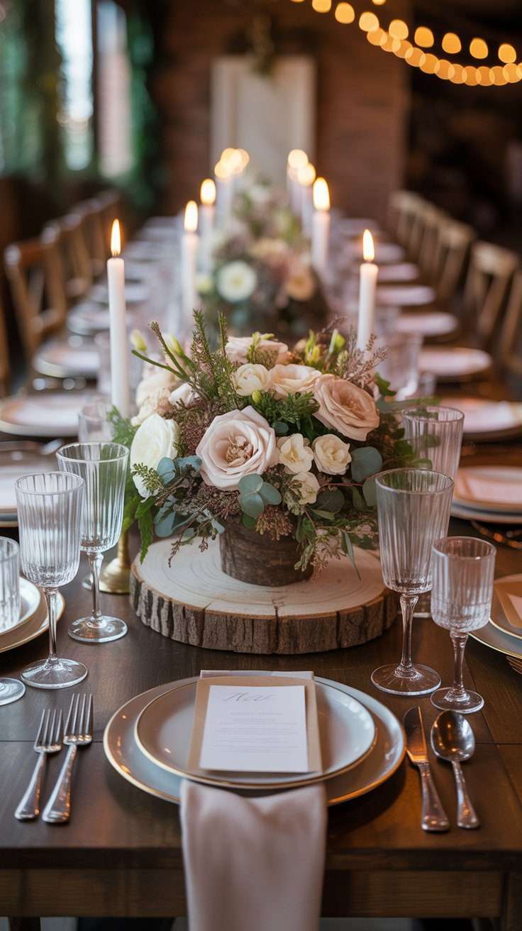 A wood slice instantly brings that woodland feel to the table. It creates a natural base that looks beautiful with soft flowers, greenery, and candles. This idea is simple, classic, and easy to style in a way that feels cozy and romantic.