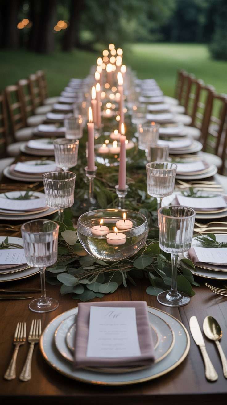 15. Floating candles with greenery-lined bowls